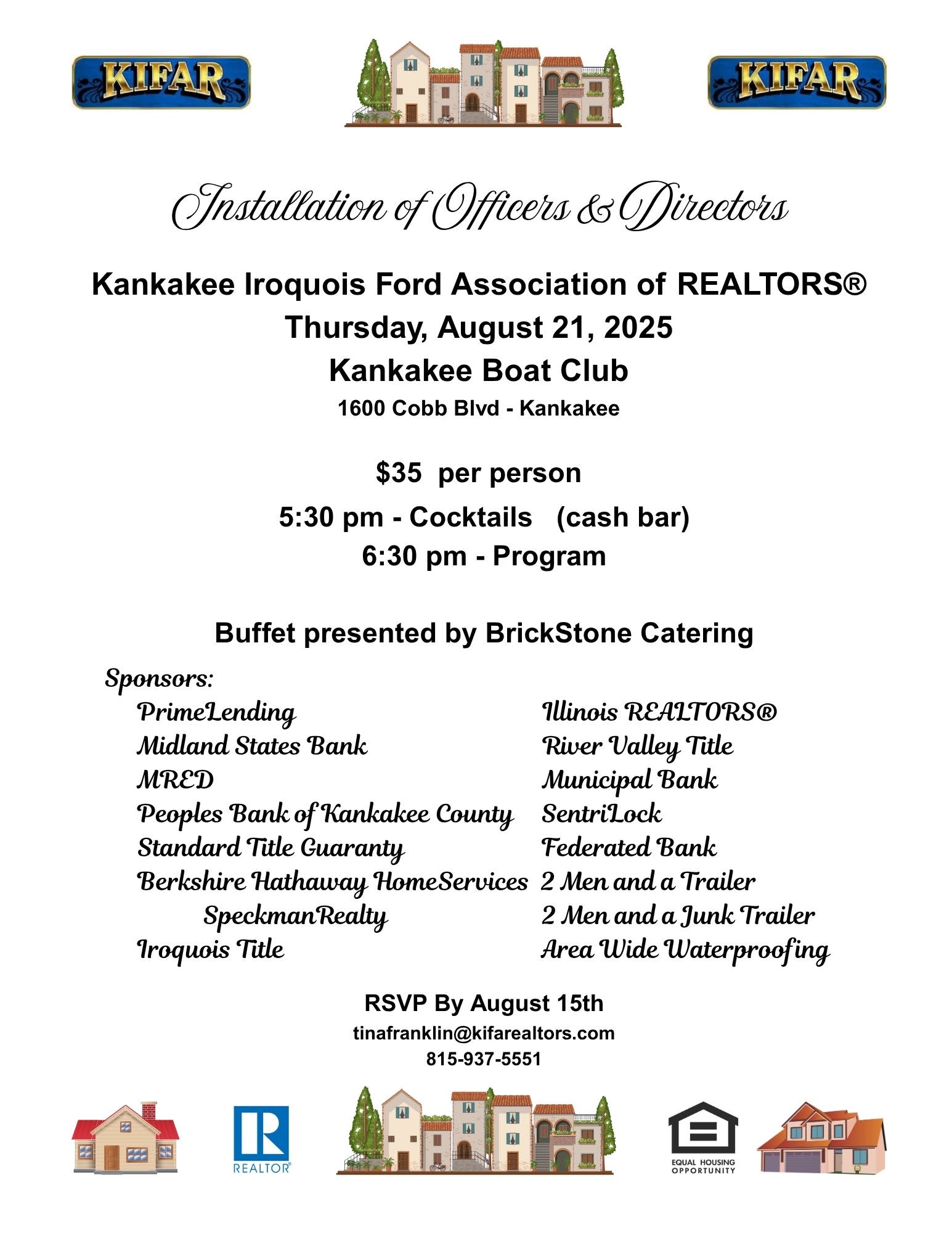 Installation Dinner for the New KIFAR Association Board of Offcers & Directors for 2026 will be held at the Kankakee Boat Club on Thursday, August 21, 2025. Cocktails begin at 5:30 pm (cash bar) and program starts at 6:30 pm. Dinner buffet presented by BrickStone Catering. Cost is $35 per person.Images